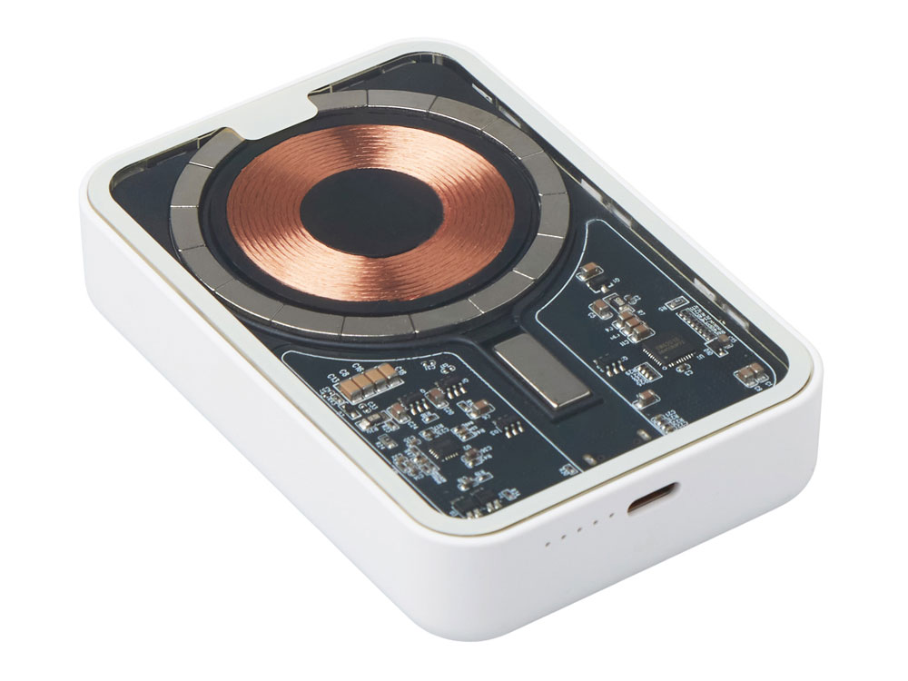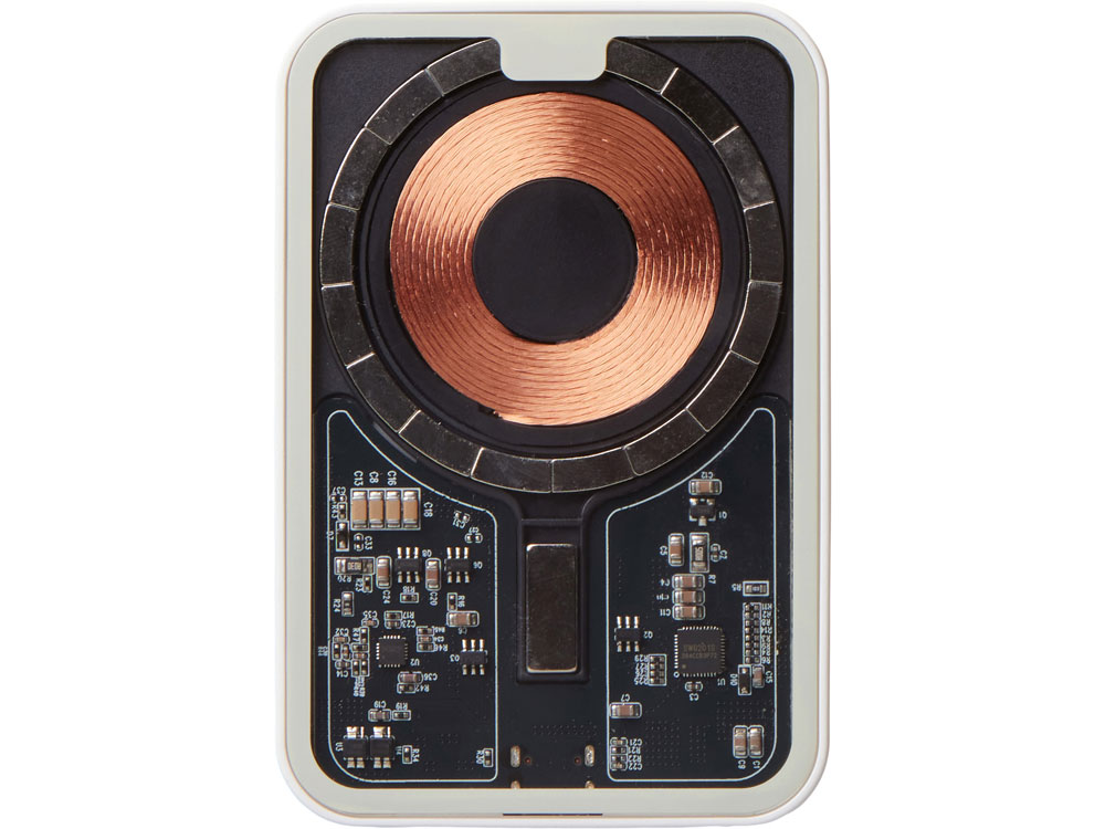 Беспроводной магнитный внешний аккумулятор MagnifIQ — технологичный и стильный power bank с эффектной прозрачной передней панелью, сквозь которую видны мощные магниты, индукционная катушка и электронная начинка. Ёмкость 10 000 мА·ч обеспечивает до 2–3 полных зарядов смартфона, а поддержка быстрой беспроводной зарядки до 15 Вт (с совместимостью QC/PD) делает процесс зарядки максимально быстрым и удобным. Двунаправленный USB-C порт позволяет как заряжать другие устройства, так и сам аккумулятор. Обе стороны корпуса подходят для нанесения логотипа: лицевая — через прозрачную панель, задняя — на приятное на ощупь soft-touch покрытие. Компактный, надёжный и сильный — идеальный технологичный продукт для продвижения и ежедневного использования. Поставляется в качественной упаковке с шубером, Двунаправленный кабель USB-C и кабель USB-A – USB-C в комплекте. • Прозрачная передняя панель — демонстрирует внутреннюю начинку и подчеркивает технологичность бренда. • Магнитная беспроводная зарядка 15 Вт • Ёмкость 10 000 мА·ч — хватает на несколько полных зарядов смартфона. • Двунаправленный USB-C — универсальность для зарядки и подзарядки. • Две зоны нанесения логотипа: на прозрачную панель спереди и на soft-touch покрытие сзади. • Сильные магниты обеспечивают надёжную фиксацию на совместимых устройствах.