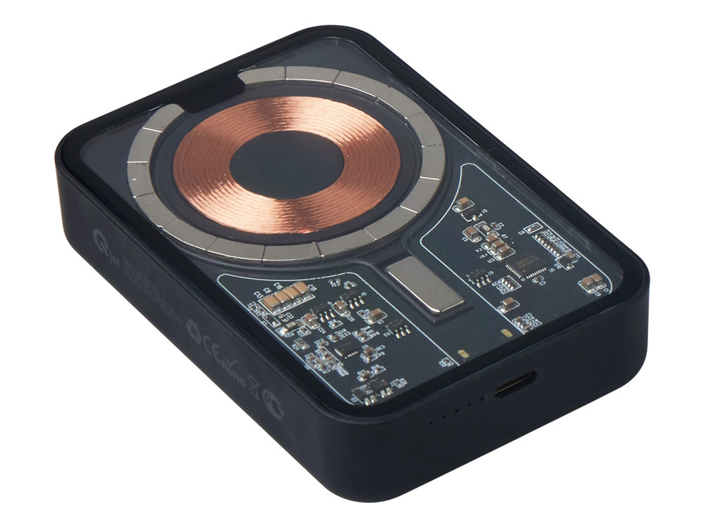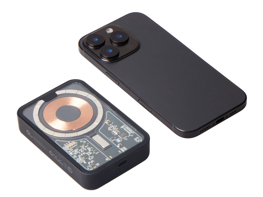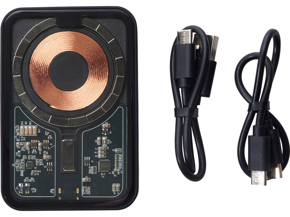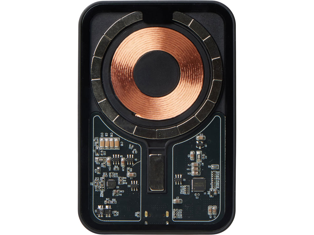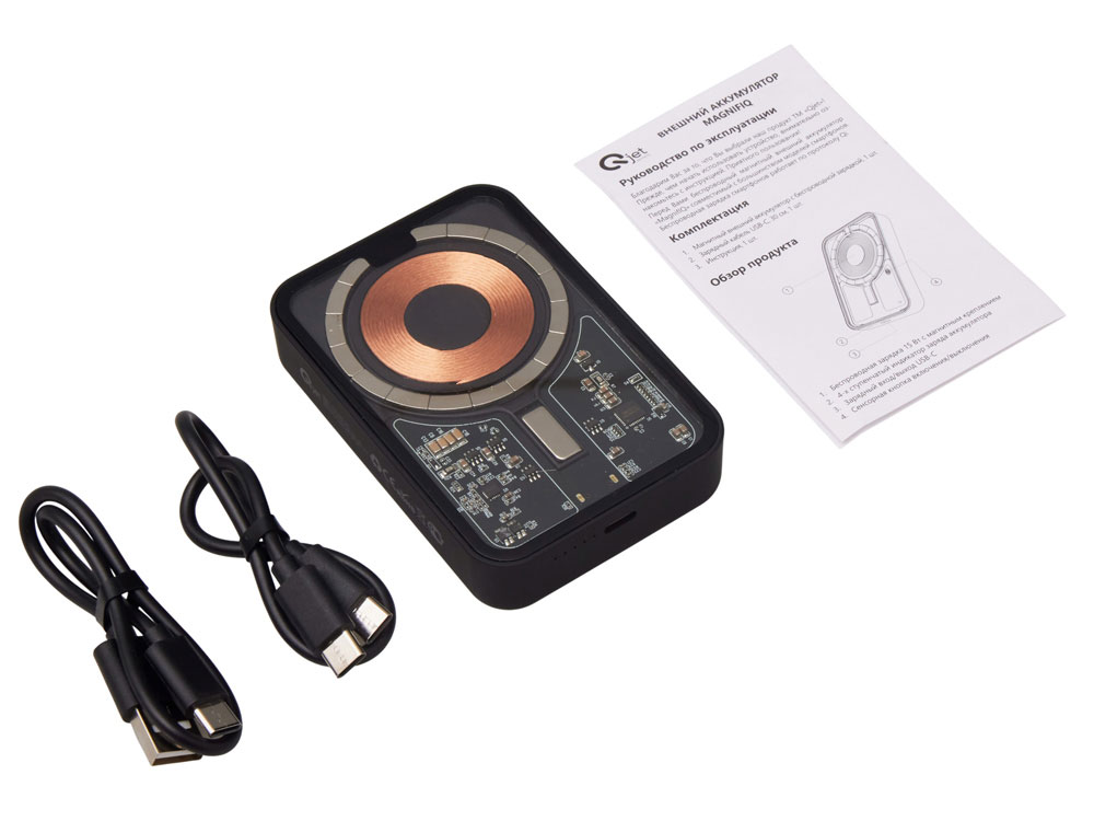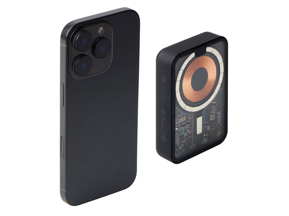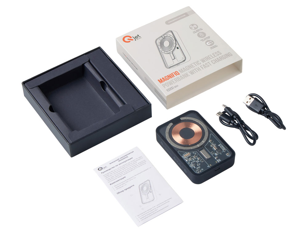 Беспроводной магнитный внешний аккумулятор MagnifIQ — технологичный и стильный power bank с эффектной прозрачной передней панелью, сквозь которую видны мощные магниты, индукционная катушка и электронная начинка. Ёмкость 10 000 мА·ч обеспечивает до 2–3 полных зарядов смартфона, а поддержка быстрой беспроводной зарядки до 15 Вт (с совместимостью QC/PD) делает процесс зарядки максимально быстрым и удобным. Двунаправленный USB-C порт позволяет как заряжать другие устройства, так и сам аккумулятор. Обе стороны корпуса подходят для нанесения логотипа: лицевая — через прозрачную панель, задняя — на приятное на ощупь soft-touch покрытие. Компактный, надёжный и сильный — идеальный технологичный продукт для продвижения и ежедневного использования. Поставляется в качественной упаковке с шубером, Двунаправленный кабель USB-C и кабель USB-A – USB-C в комплекте. • Прозрачная передняя панель — демонстрирует внутреннюю начинку и подчеркивает технологичность бренда. • Магнитная беспроводная зарядка 15 Вт • Ёмкость 10 000 мА·ч — хватает на несколько полных зарядов смартфона. • Двунаправленный USB-C — универсальность для зарядки и подзарядки. • Две зоны нанесения логотипа: на прозрачную панель спереди и на soft-touch покрытие сзади. • Сильные магниты обеспечивают надёжную фиксацию на совместимых устройствах.
