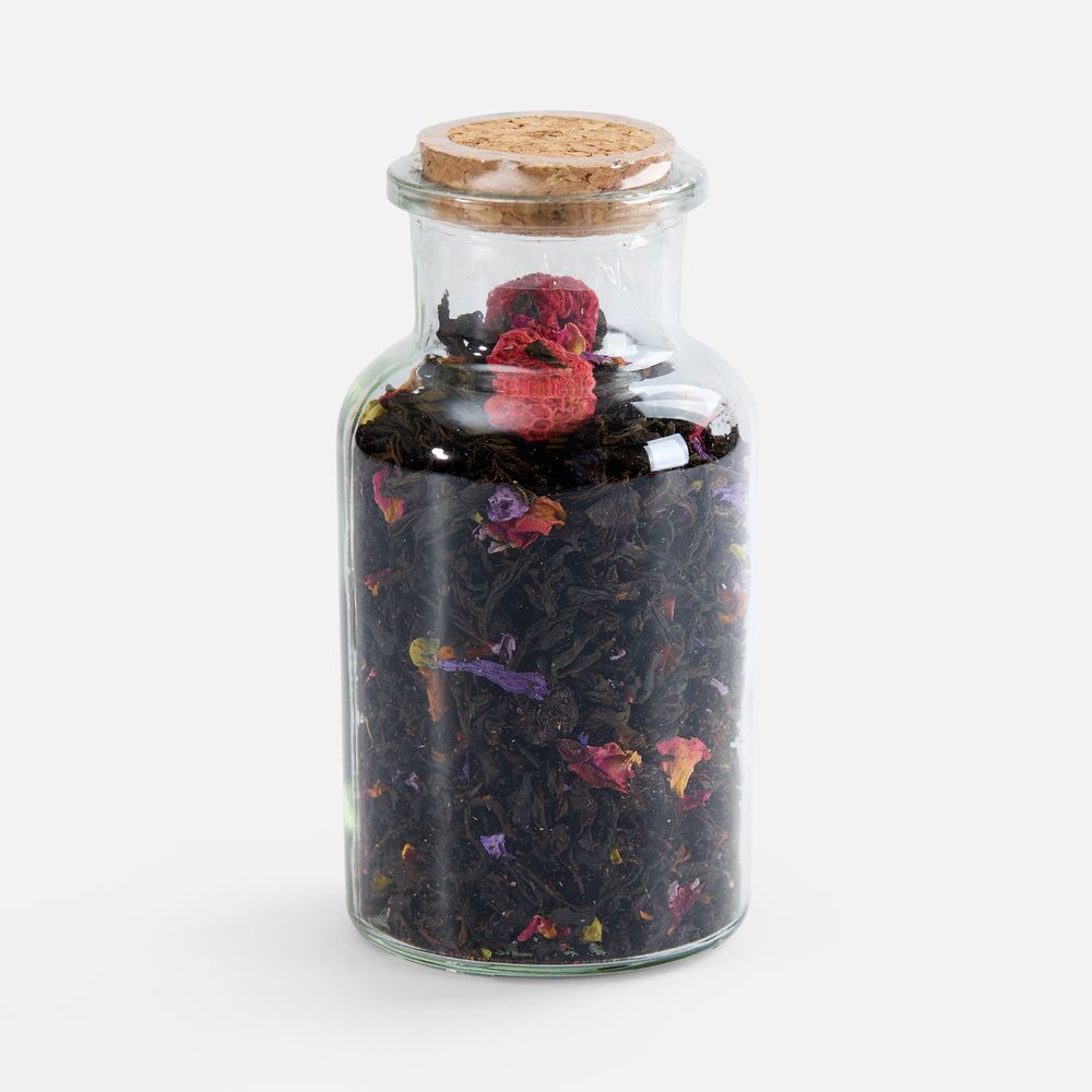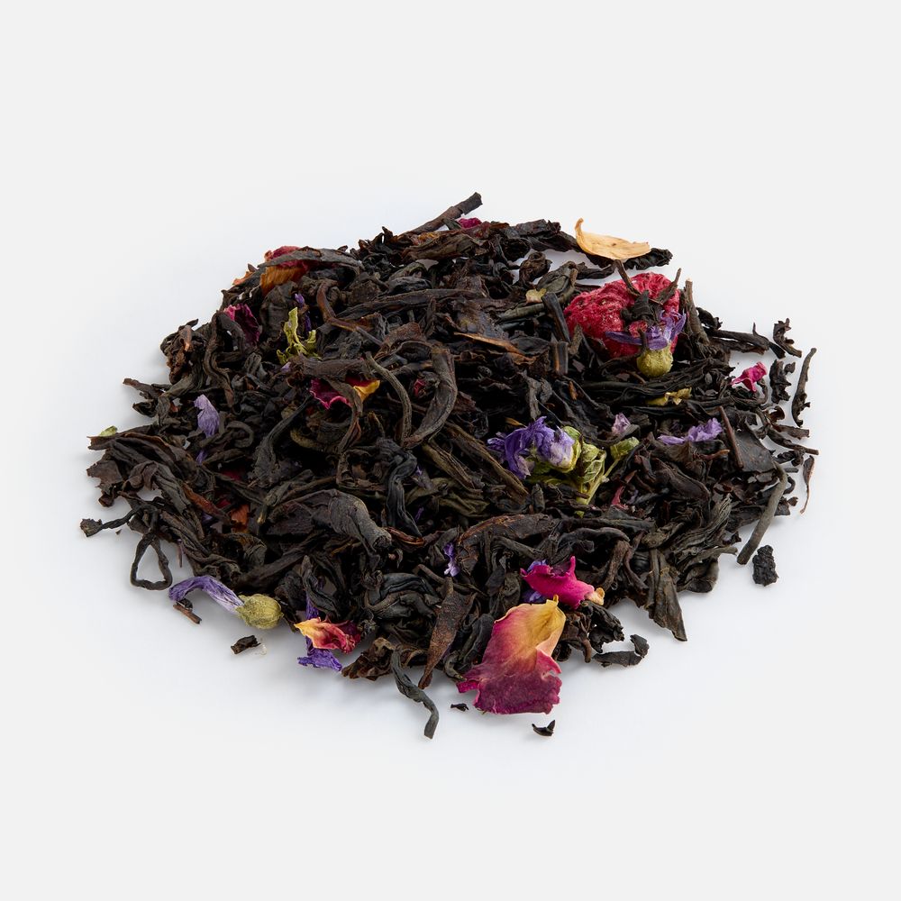 Насыщенный черный чай гармонично сочетается с бархатистой сладостью сушеной вишни и нежной кислинкой сублимированной малины. Лепестки роз и цветки мальвы добавляют напитку изысканные цветочные ноты, создающие ощущение летнего сада.