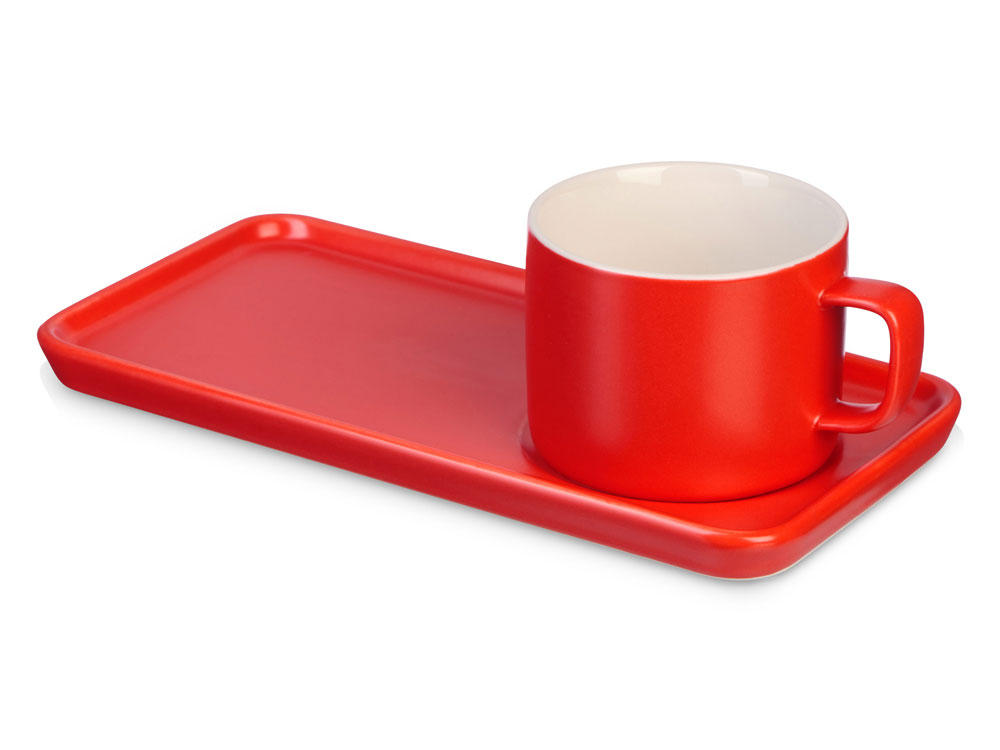 Чайная пара с необычным прямоугольным блюдцем — на нем хватит места не только для чашки, но и для пирожного. Весь силуэт этого комплекта — лаконичный, строгий, прямоугольный, что создает прекрасный фон для нанесения логотипа. Удобство этой чайной пары еще и в том, что для чашки предусмотрена отдельная ниша, которая не даст ей соскользнуть. - большое блюдце необычной формы с местом для чайного пакетика или печенья - кружка белая внутри и яркая снаружи - удобная ручка - костяной фарфор