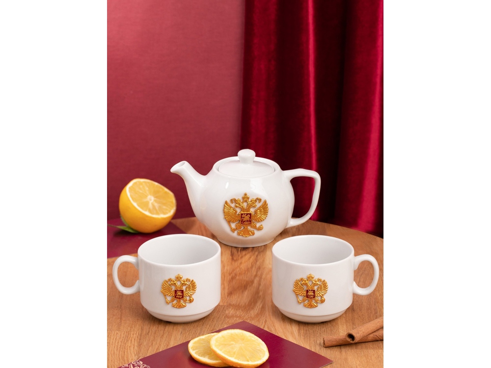 Подарочный набор чайных кружек с фарфоровый чайником Виват, Россия! Фарфоровый чайник и две фарфоровые чайные кружки с чеканным металлическим декором Двуглавый орел. Накладка изготовлена из алюминия методом чеканки с декоративной отделкой под золото. Ёмкость чашек 220 мл., ёмкость чайника 400 мл. Ручная работа.