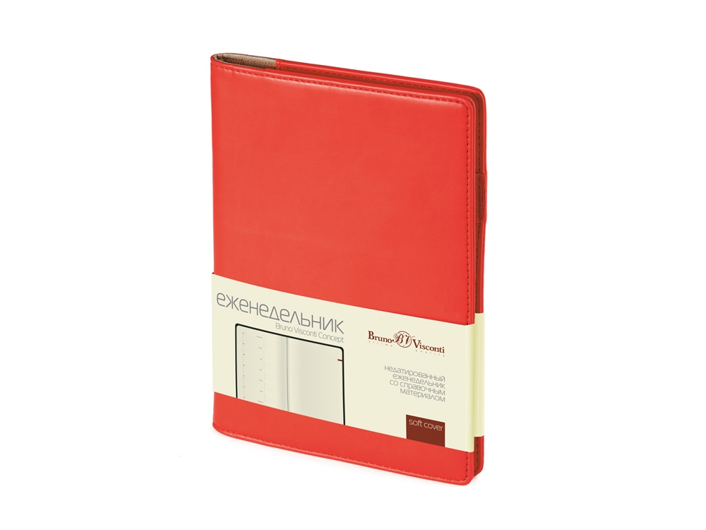 Деловые еженедельники Concept - это воплощение современного дизайна, в котором сочетаются практичные детали. Благодаря удобному формату slim-pocket еженедельник легко помещается в сумку. Еженедельник Concept в классической красной обложке формата А5. Практичный, привлекательный и приятный на ощупь материал обложки на протяжении всего срока службы сохраняет презентабельный вид. Уголки обложки имеют закругленную форму, по всему периметру сделана прострочка нитками в тон. Недатированный блок состоит из 128 страниц, укреплённых на пластиковом полускрытом гребне. На 21 странице размещена справочная информация на русском языке. День недели указан на русском и английском языках. Блок является сменным и вставляется внутрь обложки. С внутренней стороны обложка имеет вырубные отделения для визиток и кредитных карт, а также петлю для ручки на резинке. Для хранения чеков, записок и бумаг внутри расположен прозрачный пластиковый конверт.