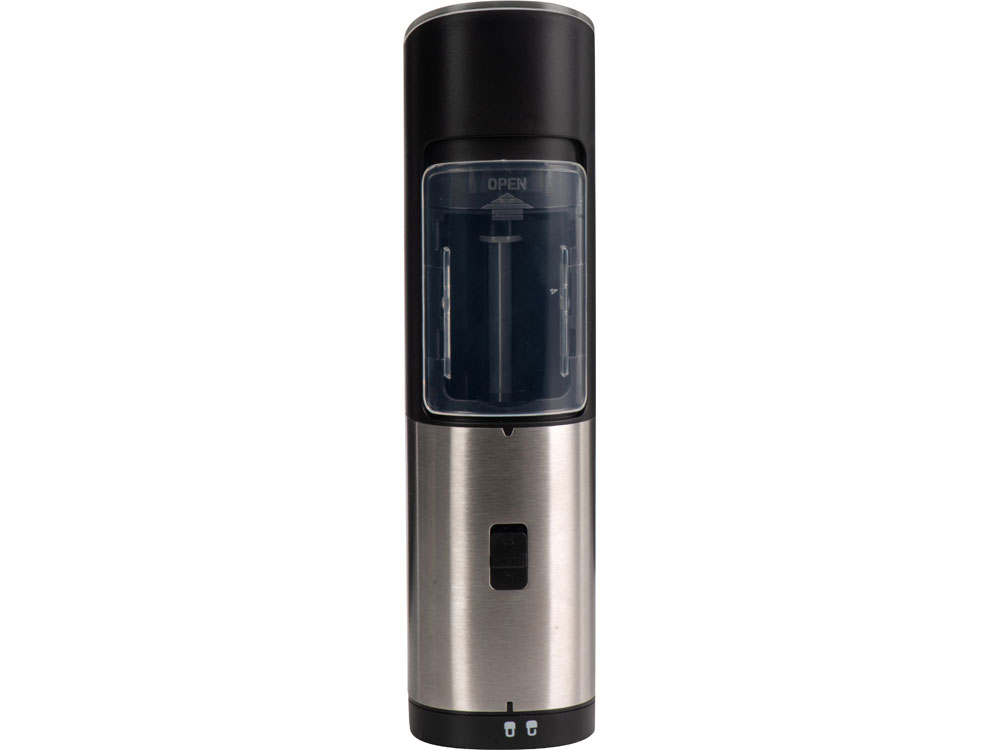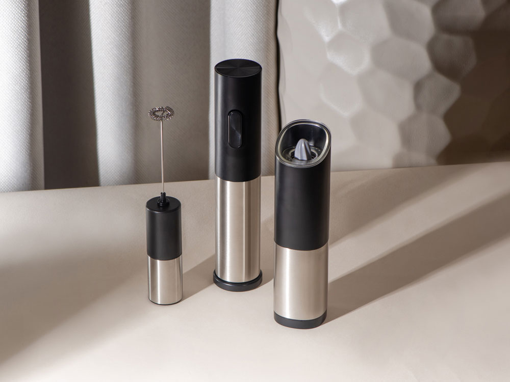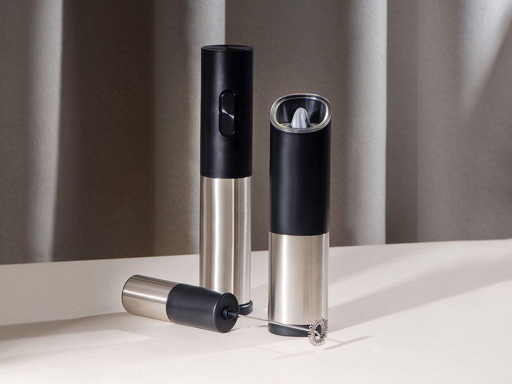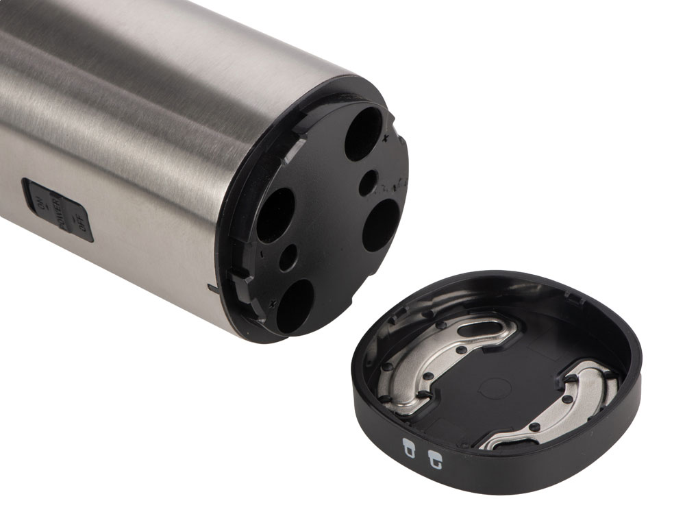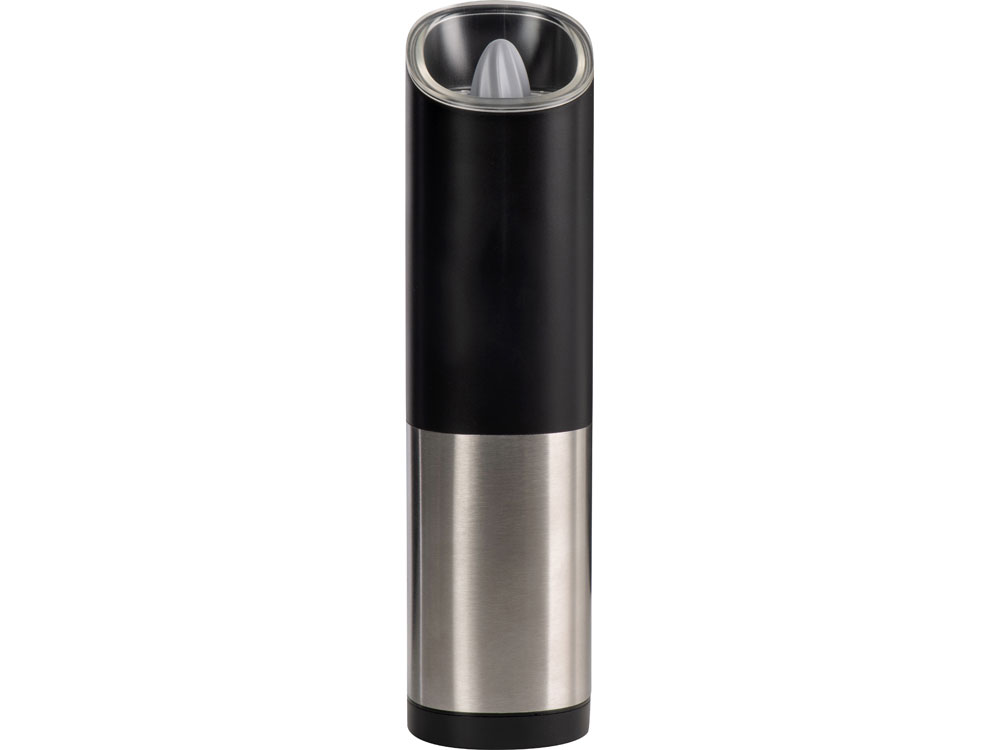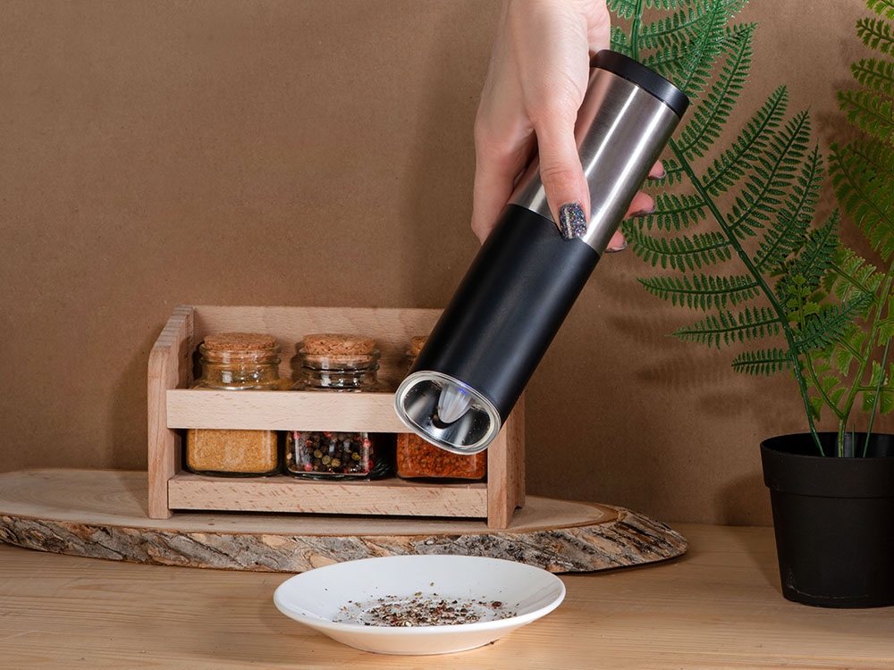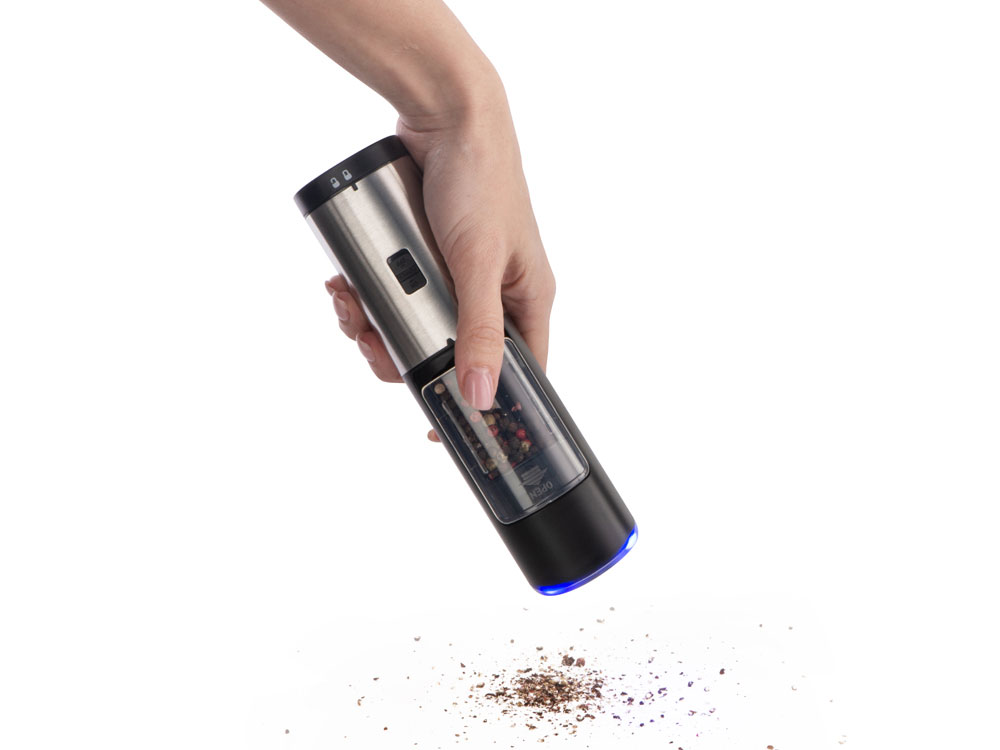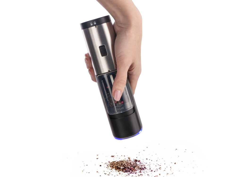 Mr. Mill от Eat&Bite Select — гравитационная мельница для перца, соли и приправ, которую просто и приятно использовать. Как использовать: 1. засыпьте специи в контейнер с прозрачной крышкой, 2. при помощи круглого ребристого тумблера установите степень грубости помола, 3. нажмите на кнопку включения, 4. переверните мельницу над блюдом, которое хотите приправить — устройство включится автоматически, а также зажжется синяя подсветка, направленная вниз, на ваше блюдо, 5. после того, как блюдо будет приправлено, переверните мельницу обратно, тумблером вверх. Мельница включается лишь в перевернутом положении, что позволяет снизить расход батареек и решает проблему случайного срабатывания устройства. Эргономичный корпус выполнен из нержавеющей стали и текстурного АБС-пластика. Питание — от 4 батареек ААА, не идут в комплекте. Для закрытия отсека с батарейками, необходимо повернуть крышку с легким усилием до характерного щелчка. - керамические жернова мельницы устойчивы к коррозии - LED-подсветка в режиме работы - вместительный контейнер для специй — 85 мл - регулировка грубости помола - поставляется в фирменной упаковке бренда - нержавеющая пищевая сталь 304 марки - для приготовления напитков и блюд - можно комбинировать с другими продуктами Eat&Bite Select в сетах - инструкция на русском языке в комплекте