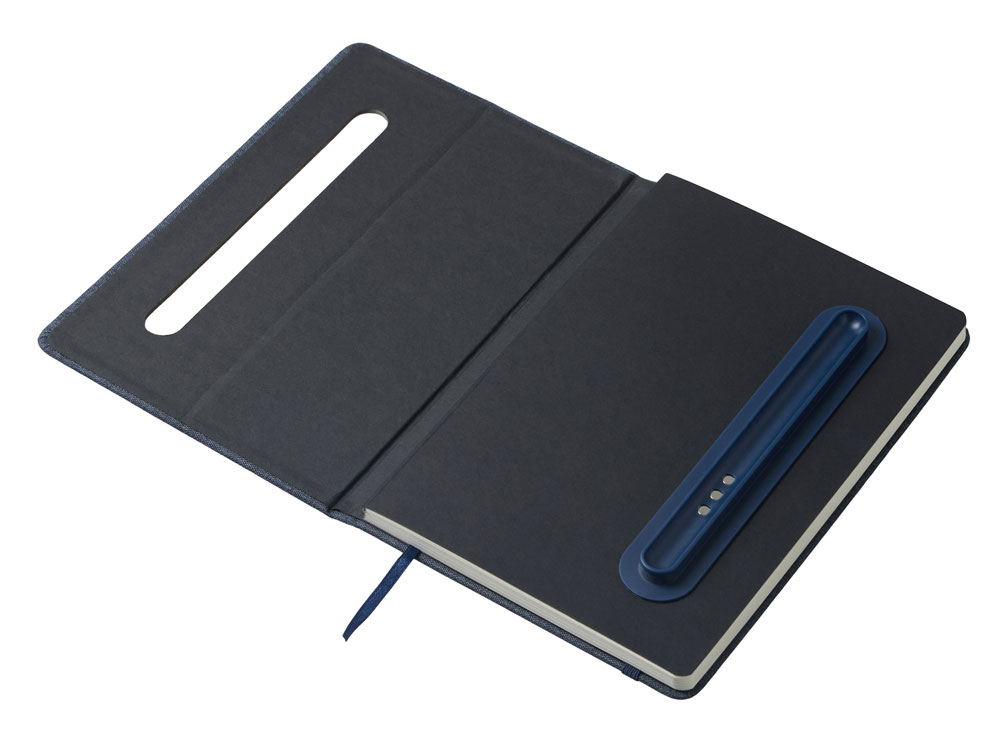 Набор блокнот А5 с магнитным держателем для ручки и подставкой для телефона и металлической шариковой ручкой NotaBene, темно-синий купить оптом и в розницу с нанесением логотипа в Самаре