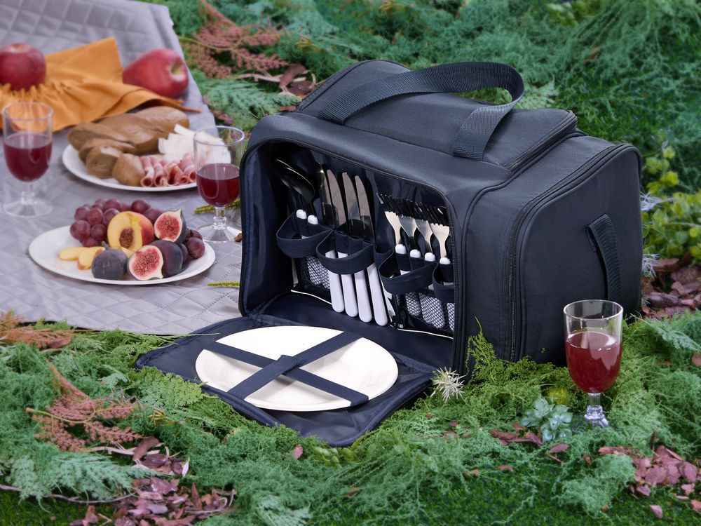 | Материал | термосумка - полиэстер, плотность 230 г/м², PEVA; тарелки и бокалы - полистирол; приборы - нержавеющая сталь, пластик |