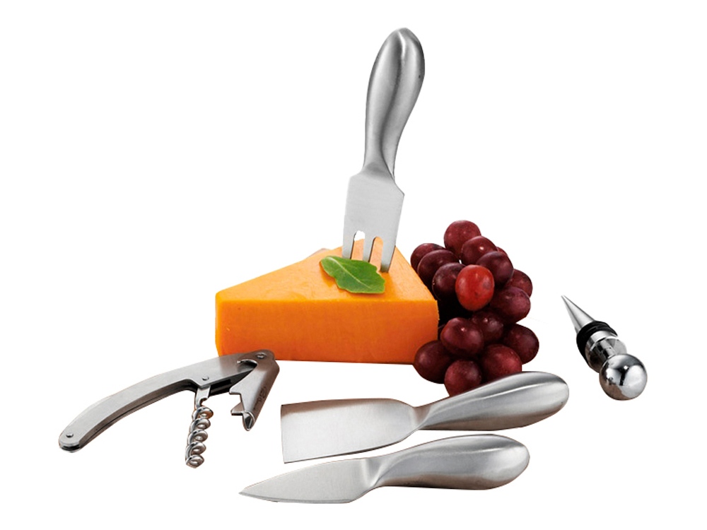 Набор для сыра и вина Mino. В этот набор из 5-ти предметов входит три ножа для мягкого сыра, твердого и зрелого сыра, стоппер для вина и штопор. Набор предлагается в деревянной подарочной коробке с шильдом 40 х 25 мм для лого.