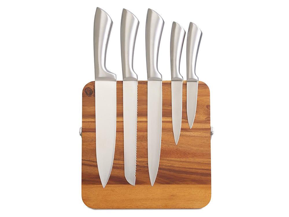 Набор ножей Терон на магнитной подставке из акации — это отличное решение для организации рабочего пространства на кухне. В комплекте пять ножей из нержавеющей стали и подставка, которая объединяет функциональность и природный стиль. Рукоятки ножей разработаны с учетом анатомии руки: они удобно лежат в ладони, не скользят и позволяют работать долго без чувства усталости. Встроенные в подставку магниты надежно удерживают ножи, при этом позволяют легко снять их одним движением. Натуральная древесина акации выглядит эстетично и премиально, поэтому подойдет под любой интерьер. Главное достоинство подставки из акации — высокая стойкость к влаге, она прослужит долго, стойко перенося влагу и механические нагрузки. Такая подставка обеспечит владельцу удобство на кухне, все ножи находятся всегда под рукой, что избавляет от необходимости искать нужный инструмент в ящике. - Удобное хранение ножей - Подходит для любого интерьера - Эргономичная рукоять ножей - Крепкая фиксация за счет магнитов В набор входят: магнитная подставка поварской нож (340 х 40 мм) универсальный нож (335 х 26 мм) нож для хлеба (335 х 30 мм) нож для овощей (230 х 20 мм) нож для овощей (200 х 20 мм)