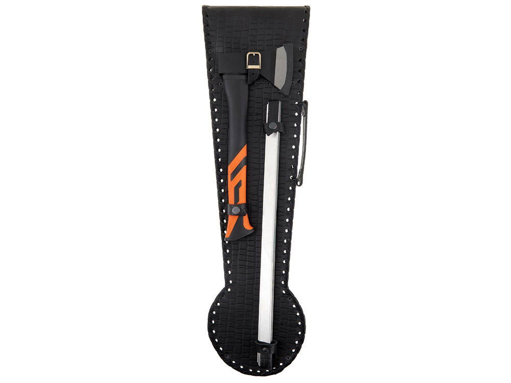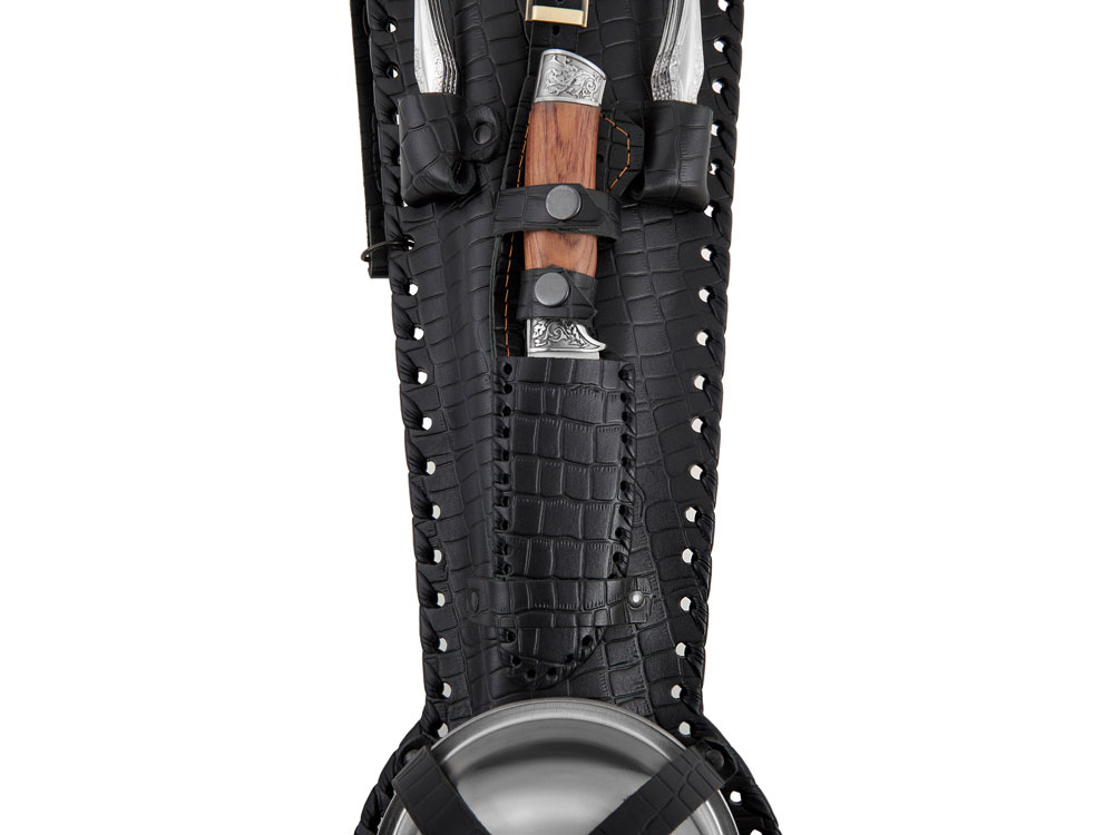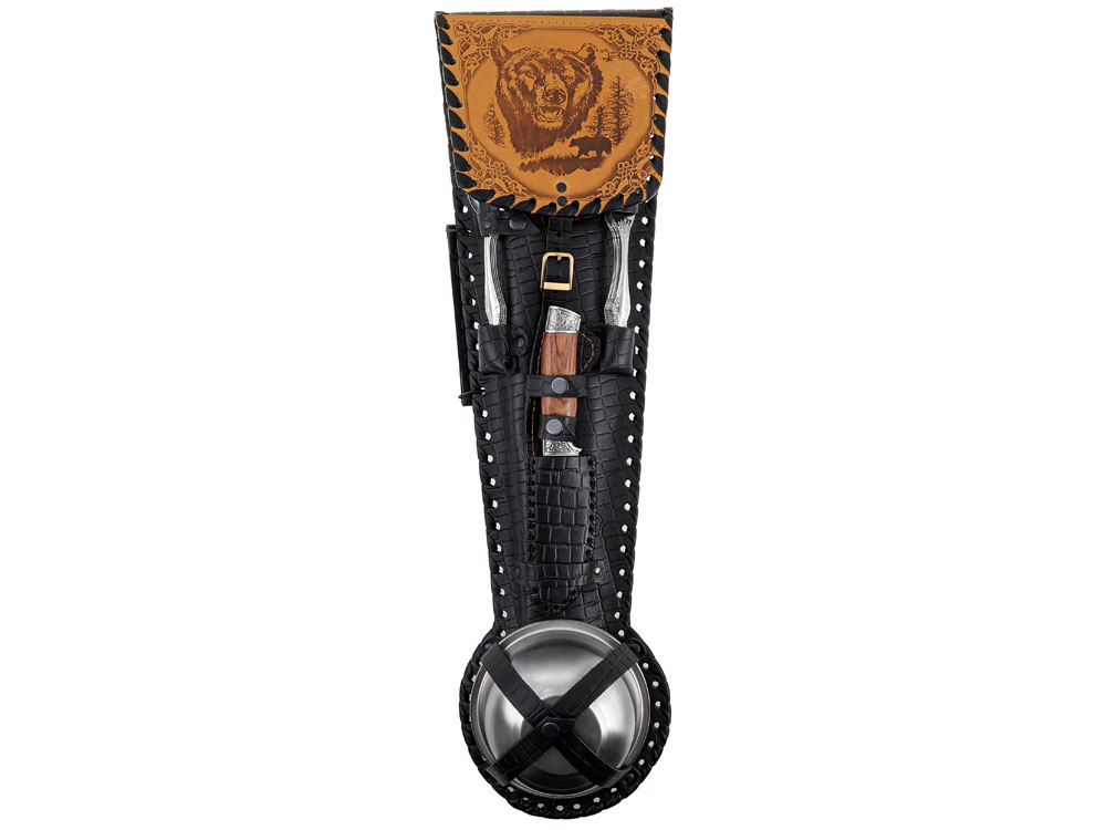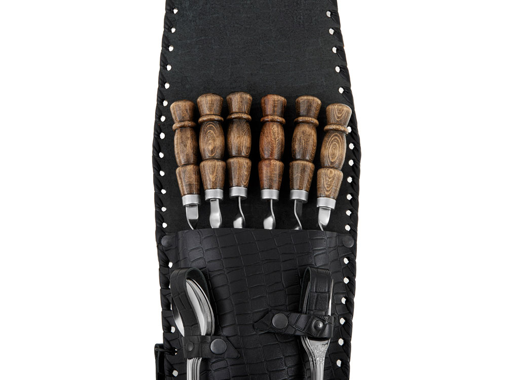 Набор для пикника в кожаном чехле ручной работы. В комплект входит: Тарелка 700 мл d16 х 6,4 см - 6шт Стопка d5,3 х 5,7 см - 6шт Нож 25,7 х 3,6 х 2 см - 1шт Ложка 19,3 х 4,5 х 2,7 см - 6шт Вилка 19,3 х 2,5 х 1,7 см - 6шт Топор 39,5 х 14,5 х 3,2 см - 1шт Ножки для мангала 50,5 х 31 х 1 см - 2шт Шампур d2,6 х 66 см - 6шт