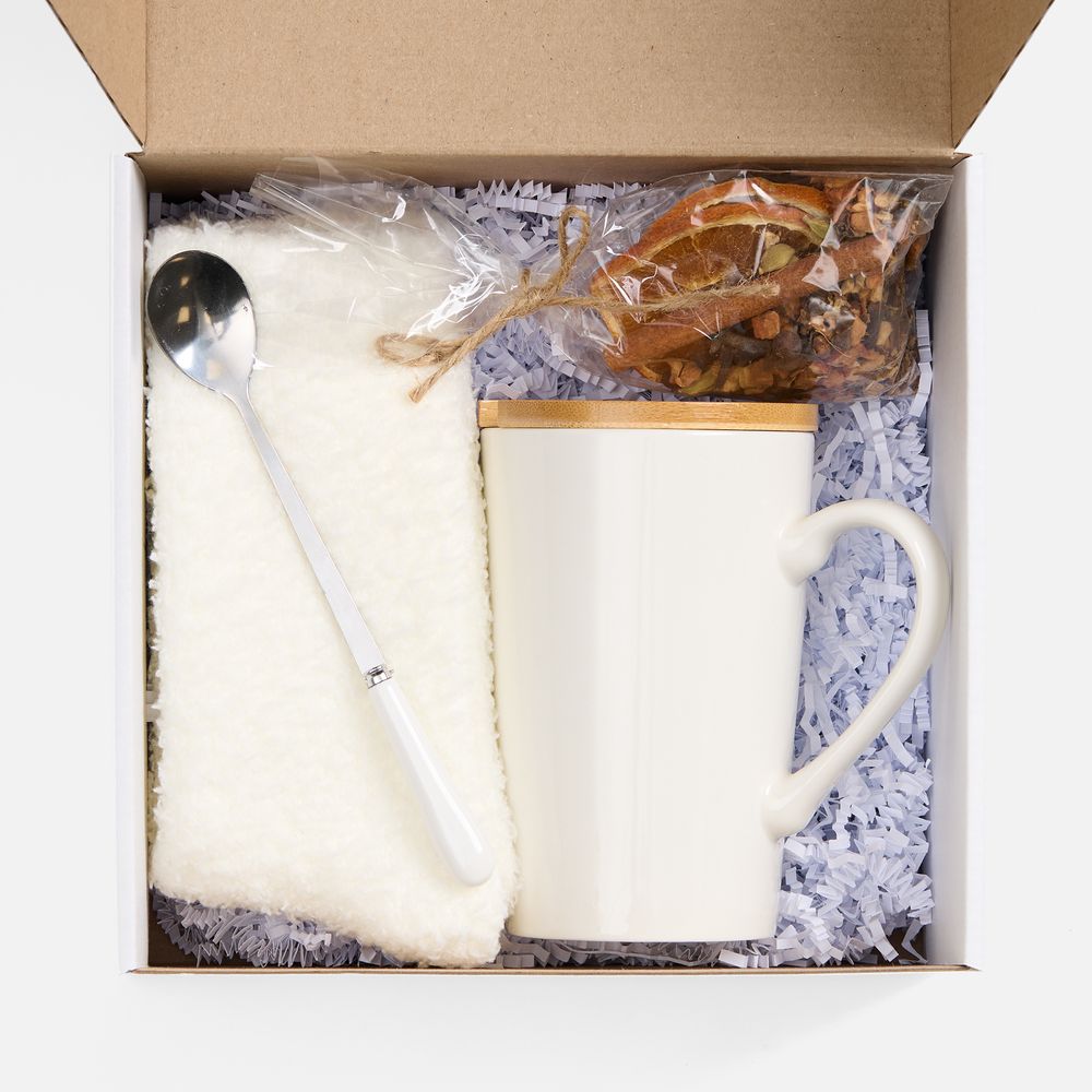 Материал кружка - фарфор, крышка - бамбук; ложка - нержавеющая сталь; носки - полиэстер 100%; коробка - микрогофрокартон, Т-23Е