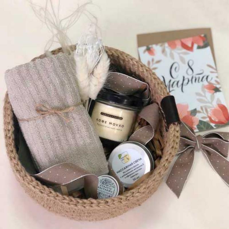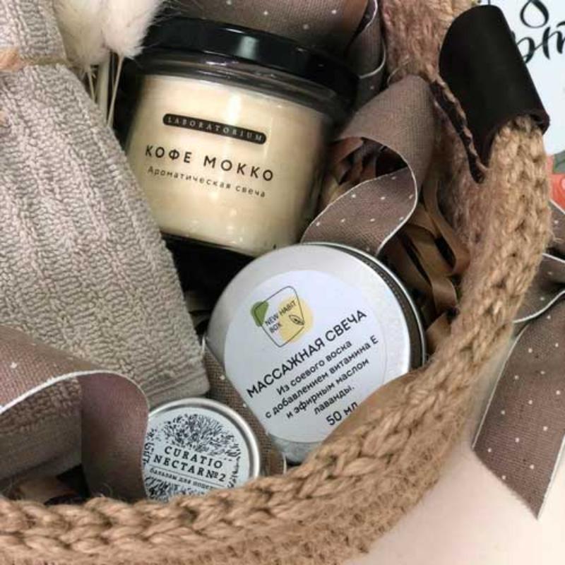 | Состав | Полотенце хлопковое, свеча соевая Кофе Мокко, массажная свеча с лавандой, бальзам для поцелуев, сухоцветы, дизайнерская открытка (на выбор), плетеная корзина из джута ручной работы |