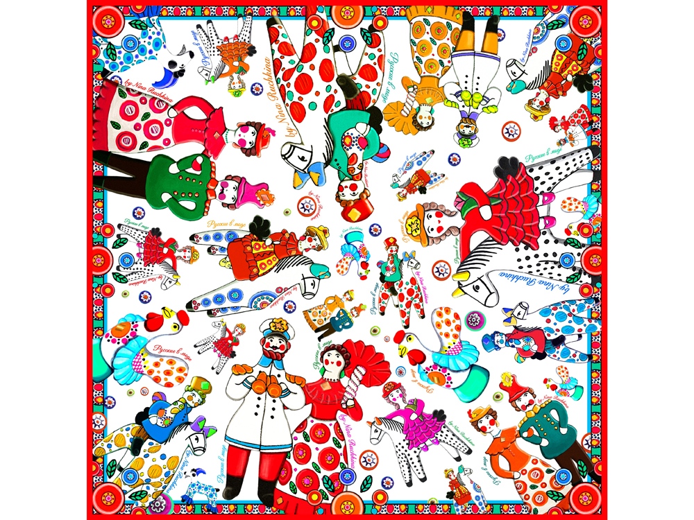 Дымковская игрушка - это один из самых старинных промыслов России, существующий более четырёхсот лет. Нарядная и жизнерадостная, она ценит компанию, радость и задор. Именно такое настроение несёт в себе дизайн платка с изображением милых и таких родных сердцу образов. Забудьте про одиночество, уныние и хандру: в таком платке захочется улыбаться и парить в воздухе не только Вам, но и окружающим! Насыщенные, глубокие цвета, искренность и теплота народного искусства - история России ещё никогда не была столь выразительной и красноречивой. Советы по уходу: -Наши платки сделаны с душой и нуждаются в ответной душевной заботе и внимании. -Они практически не мнутся, очень приятные на ощупь, нежные и мягкие. Любят бывать на людях, посещать светские мероприятия, не выносят одиночества. -Всегда готовы к экспериментам и смелым сочетаниям. Прослужат верой и правдой долгие годы, никогда не выйдут из моды и всегда будут уместны и кстати. -Ручная стирка 40 градусов.