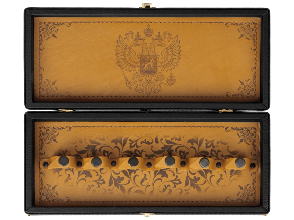 Футляр из эко-кожи, внутренняя отделка натуральная кожа рыжего цвета. Рисунок нанесен путем термообработки. В набор входит шесть стопок по 30 мл. Хрусталь, литьё.