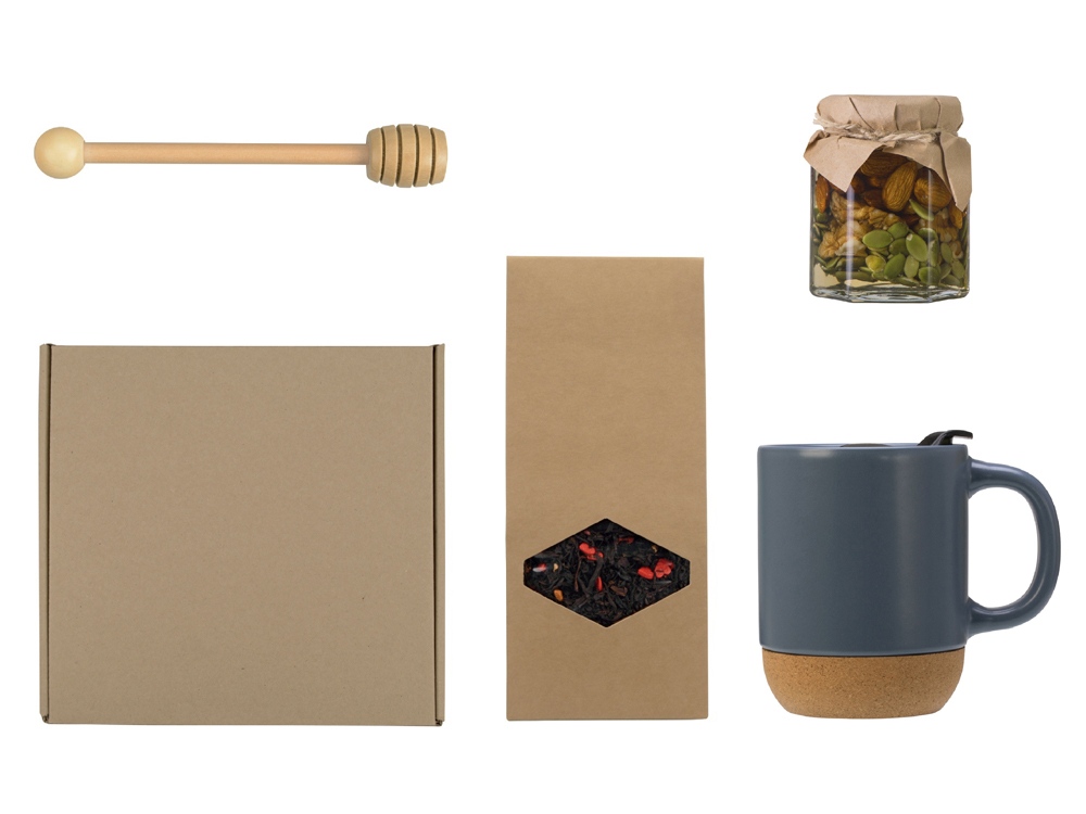 | Материал товара | кружка - керамика, пробка, мед в банке - стекло, ложка - бамбук, чай - крафт-коробка, коробка - картон |