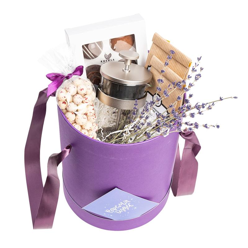 • Подарочный набор Лаванда содержит: чай (Дарджилинг даджи и Жемчужина слива), френчпресс 350мл, конфеты трюфеля ручной работы, фундук в молочном шоколаде, Лаванда (сухоцвет)