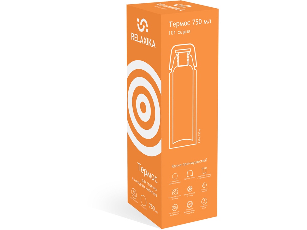 Классический термос Relaxika с высокими показателями удержания температуры напитка для походов, путешествий, спорта и ежедневного использования. Прочные двойные стенки из высококачественной нержавеющей стали 18/8 с вакуумной изоляцией гарантируют, что ваш напиток останется холодным в течение 36 часов и горячим до 30 часов. Этот материал не только прочен, но и гигиеничен, не выделяет никаких вредных для здоровья веществ. Ваши напитки сохраняет естественный вкус и не приобретут посторонний запах. Напиток остается холодным до 36 часов и горячим до 30 часов. - Узкое горлышко позволяет удерживать температуру максимально долго - Крышку термоса можно использовать как чашку BPA Free. В пластмассах, используемых для производства термосов, отсутствует Бисфенол А - Надежная закручивающаяся пробка с силиконовым кольцом защищает от протекания и помогает удерживать температура - Высококачественная нержавеющая сталь 18/8 Рекомендации по уходу Не рекомендуется использовать посудомоечные машины при мытье изделия. Мойте мягкими губками и жидкими моющими средствами. Не используйте сухие абразивные средства чтобы не поцарапать поверхность. После мытья необходимо протереть сухой салфеткой или полотенцем и оставить сушиться без крышки. Не для микроволновой печи или морозильной камеры. Чтобы предотвратить утечку, тщательно закройте верхнюю крышку.